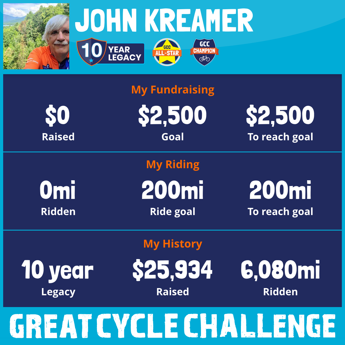 Sadly Craig passed away on 19 Aug. 2020. He was diagnosed with stage 4 pancreatic cancer in April while serving as President of the Blue Ridge Bicycle Club in Western North Carolina. I have dedicated this September's GCC rides in honor of him. He was a good man who is missed by all who knew him and by those whose lives he touched. What a better way to celebrate his life than by helping put an end to cancer. RIP my friend.