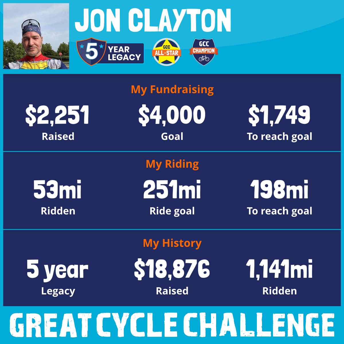 This September, for my fourth year, I will be riding with the Great Cycle Challenge to fight kids' cancer! This campaign has raised over $72 Million Dollars since its inception in 2017. Last year we raised over $9 Million! Each year thousands of riders sign up to pedal and petition their friends, family, and network to support this worthy cause. I am proud to be part of the GCC Champions.