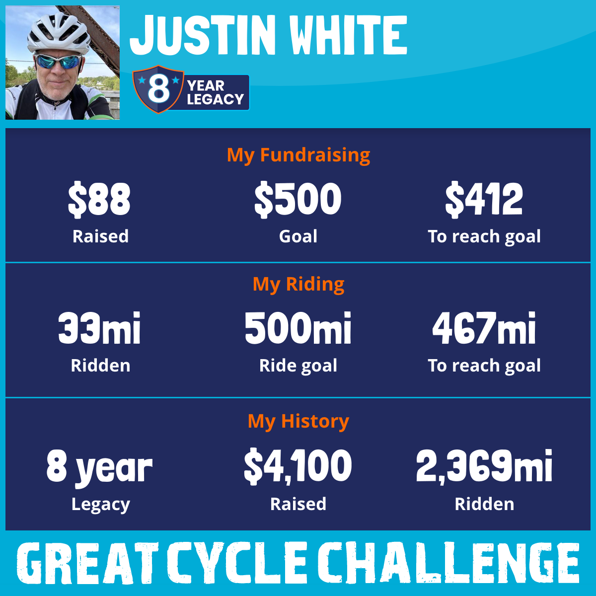 Dad, I am riding to reach my goal in your honor. You are doing everything you can to fight this deadly disease. With my efforts to raise money, I hope to give cancer survivors like you a fighting chance. Your son, Justin