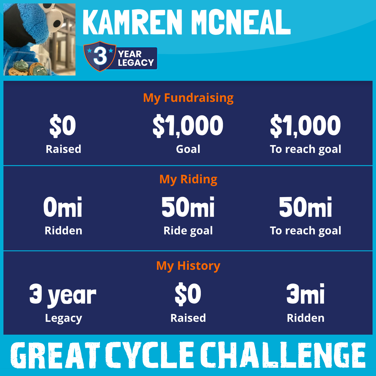 I am riding 50 mi in memory of my cousin, Le’Meriael Booker. Please sponsor me and support my challenge to fight kids' cancer and save little lives.