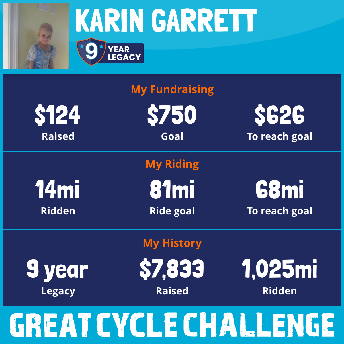 I am riding 100 mi in memory of Charlotte Kelly. Please sponsor me and support my challenge to fight kids' cancer and save little lives.