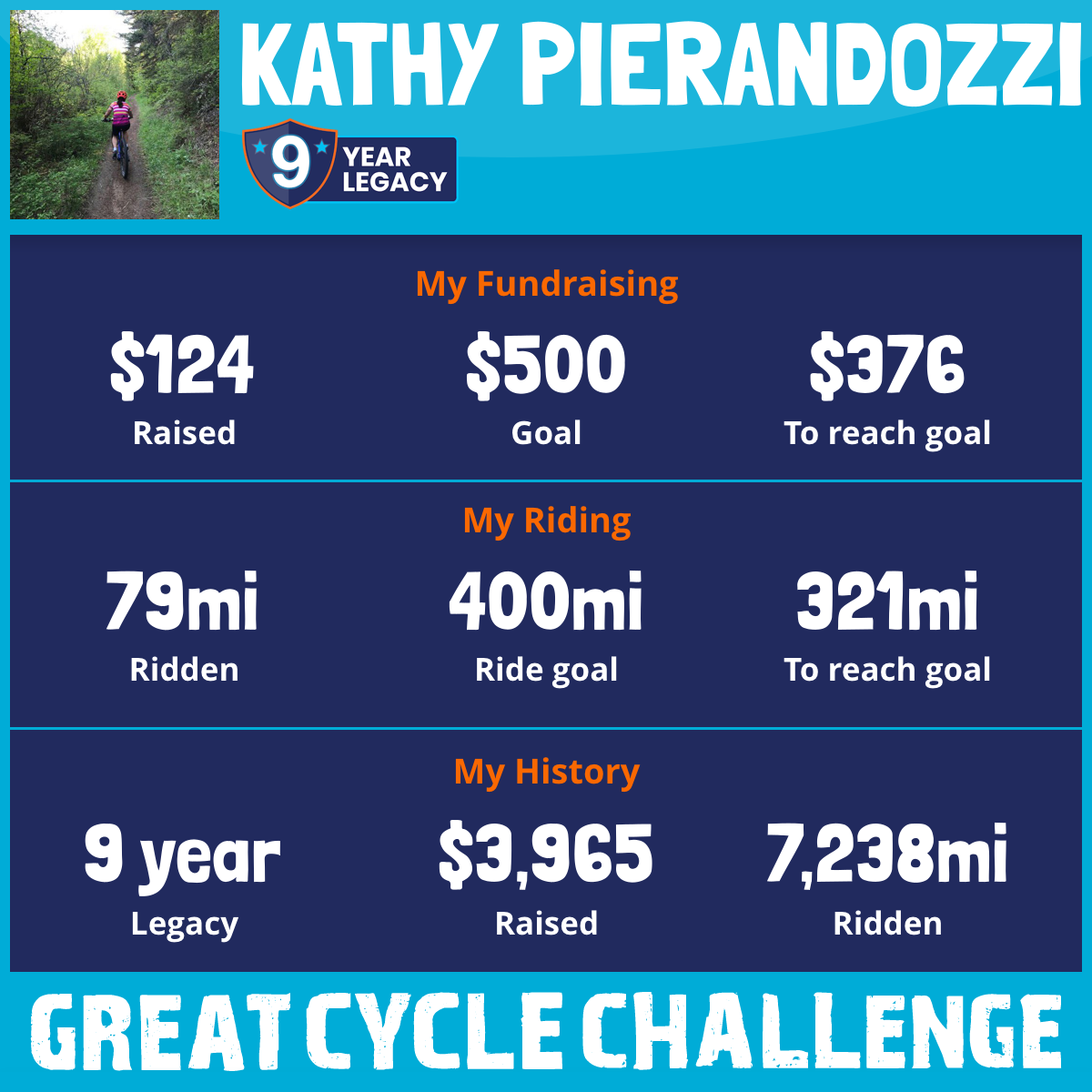 I am riding 400 mi for my friend, Carla Pierandozzi, Darla Bowley, Susan Newstat David Everingham. Please sponsor me and support my challenge to fight kids' cancer and save little lives.