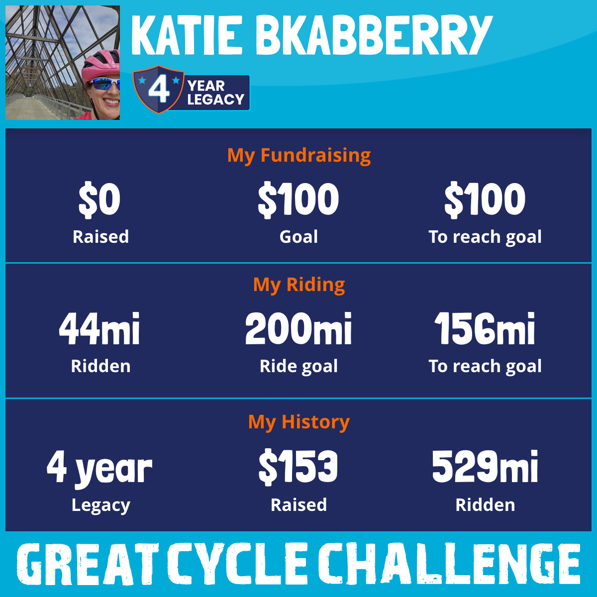 I am riding 200 mi for Abby Berry. Please sponsor me and support my challenge to fight kids' cancer and save little lives.