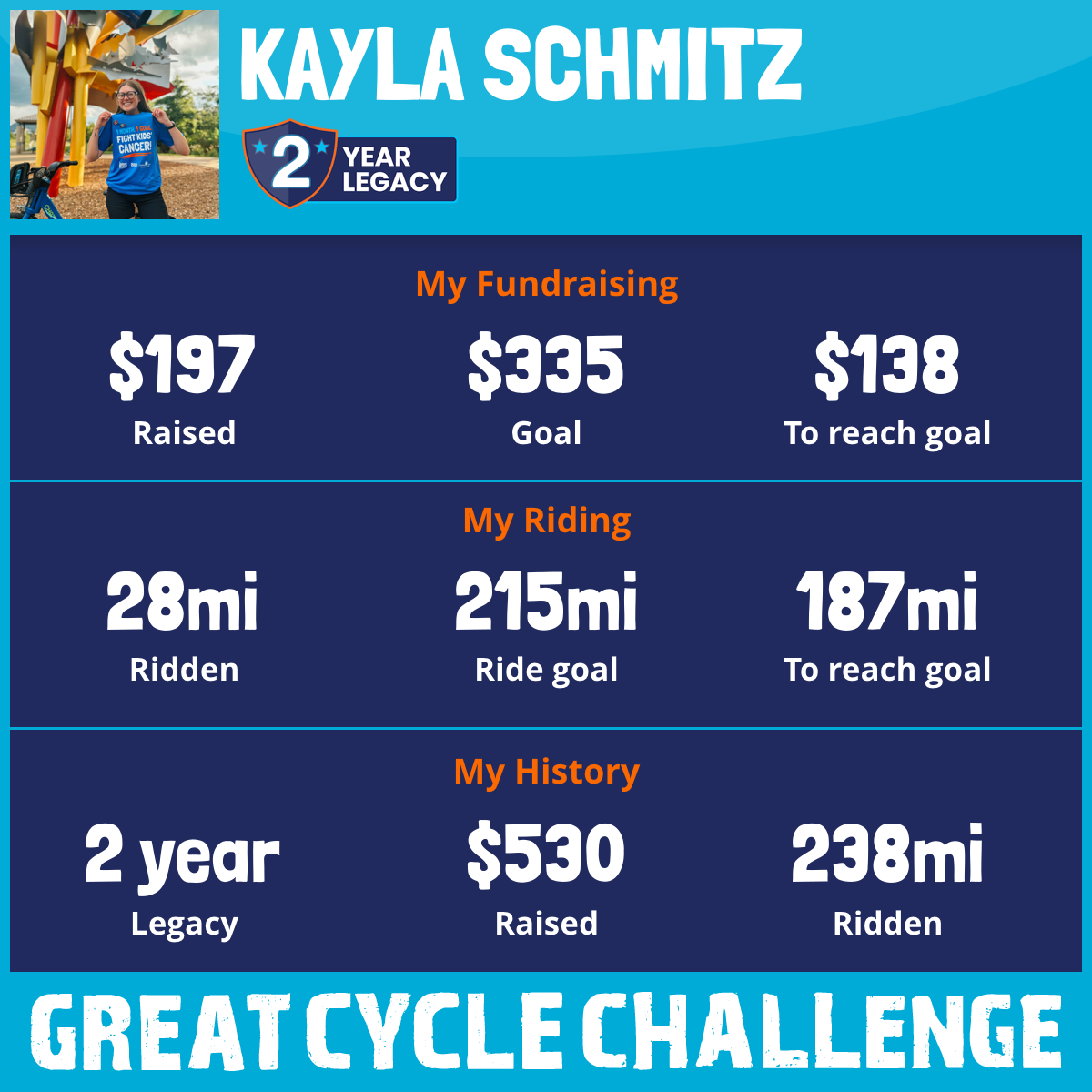 While I didn’t end up working in pediatric oncology, that passion has never left me. Supporting the Great Cycle Challenge is my way of continuing to fight for these brave kids — to honor those we’ve lost, and stand with those still in the fight. Every mile I ride this September will be for them.