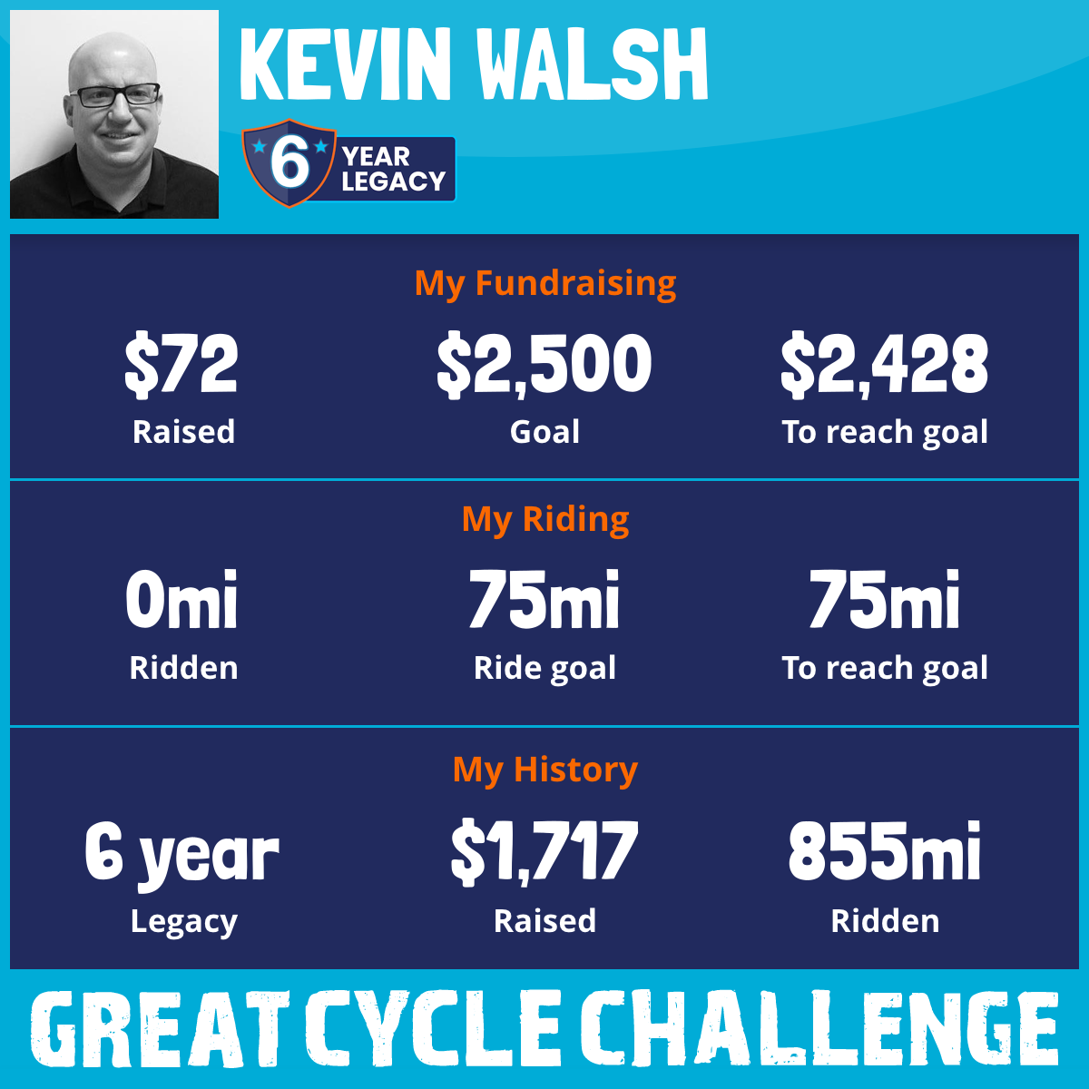 I am riding 100 mi in memory of my myself, Kevin Walsh (that is me. Please sponsor me and support my challenge to fight kids' cancer and save little lives.