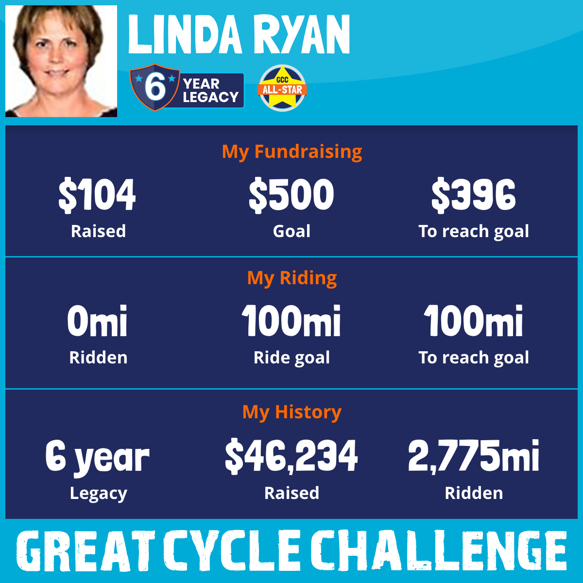 In September 2025, I will once again be taking part in the Great Cycle Challenge to fight kids' cancer! This will be my sixth year participating and my riding goal for this year will be 200 miles AND fundraising goal of $5,000.