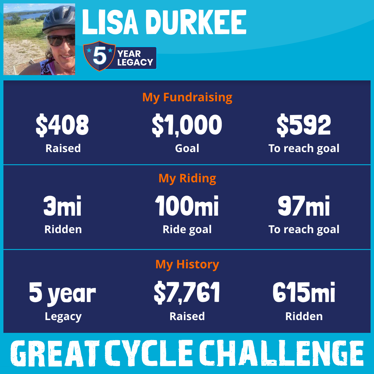 Though this challenge is to support research for children's cancers, I am riding this year in memory of my dear brother-in-law, Lance. His was a valiant fight over seven years, but cancer finally claimed his life. Knowing the entire family's struggle, I am riding in hope of easing the pain for other families and their children. Thank you for your support.
