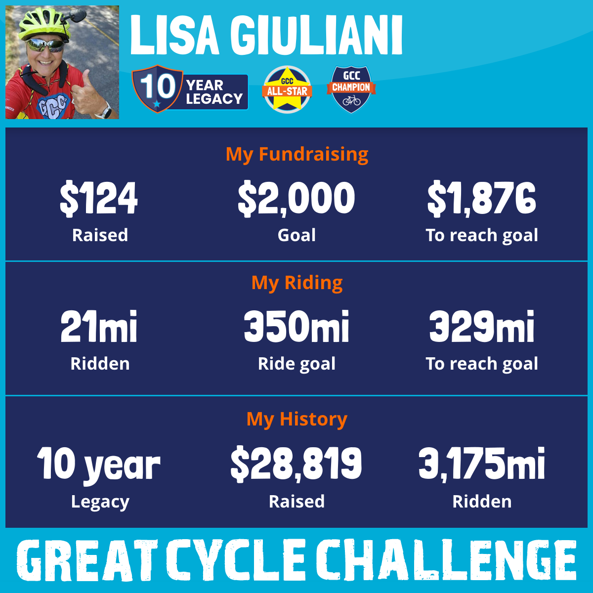 This September, for the 10th year in a row, I am taking part in the Great Cycle Challenge to fight kids' cancer! Great Cycle Challenge started in 2015, and after just 10 years, the event has grown to become one of the biggest cycling events in the United States. In 10 years, our community of riders from all 50 states has ridden a total of 33,817,103 miles, and together we’ve raised $72,646.876 in support of research to develop better treatments and find a cure for childhood cancer. Although I did not participate in 2015, over the past 10 years, I have ridden 3,154 miles, and with the help of family, friends, and neighbors, I have raised $28,818.70 for the Children's Cancer Research Fund. This year, my mileage goal is 350 miles, and my financial goal is $2,000 to reach and surpass $30,000 raised over the 10 years I've been a participant. Will you help me reach my financial goal? I'll take care of the miles and my own donation on Match Day, to be announced.