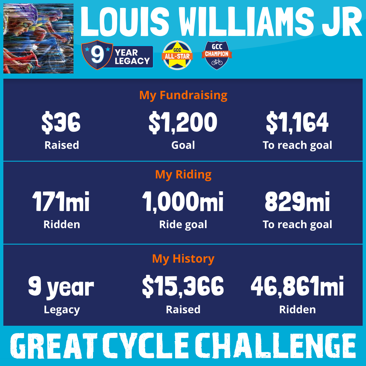 10,868 mi Ridden$3,339 Raised2023