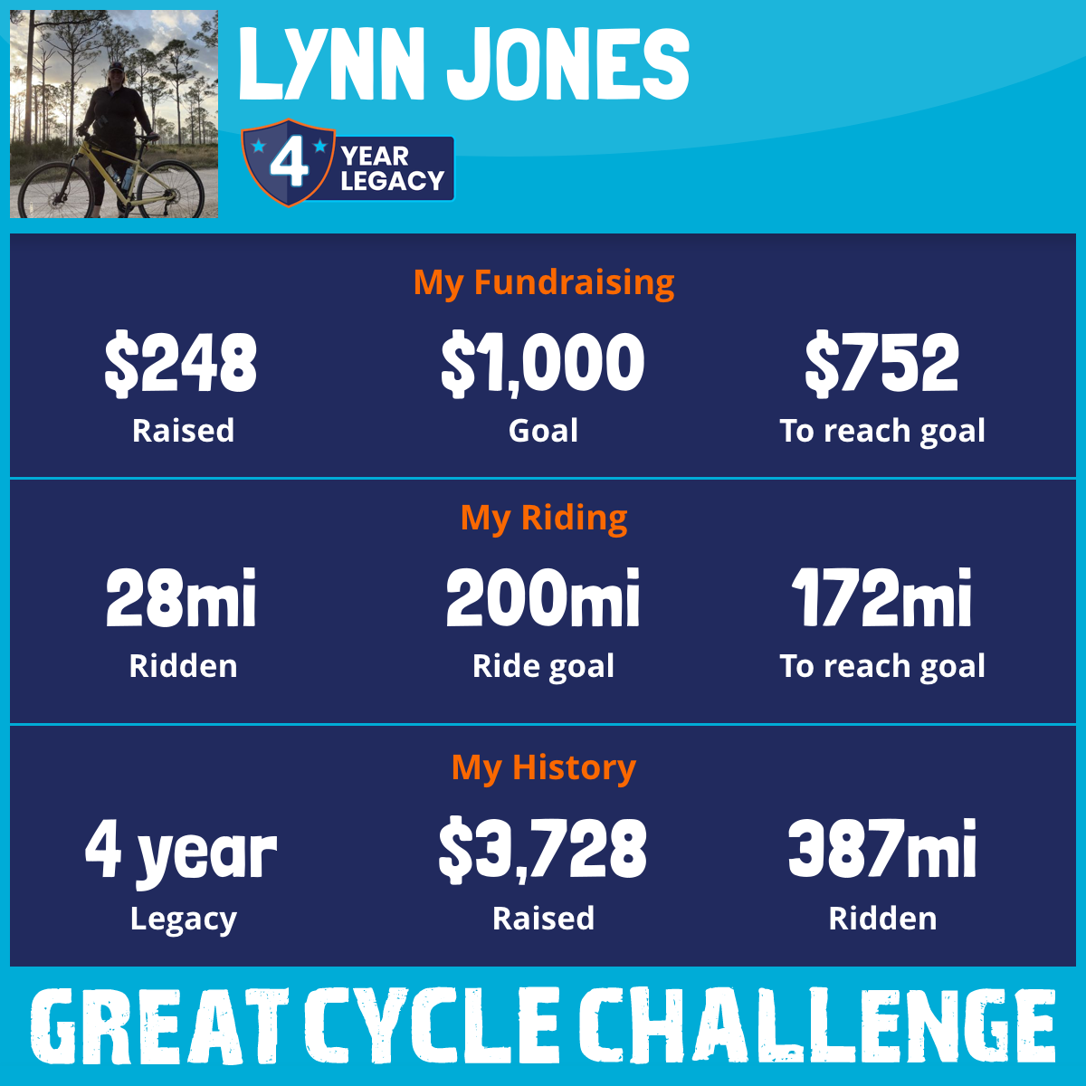 121 mi Ridden$1,296 Raised2023