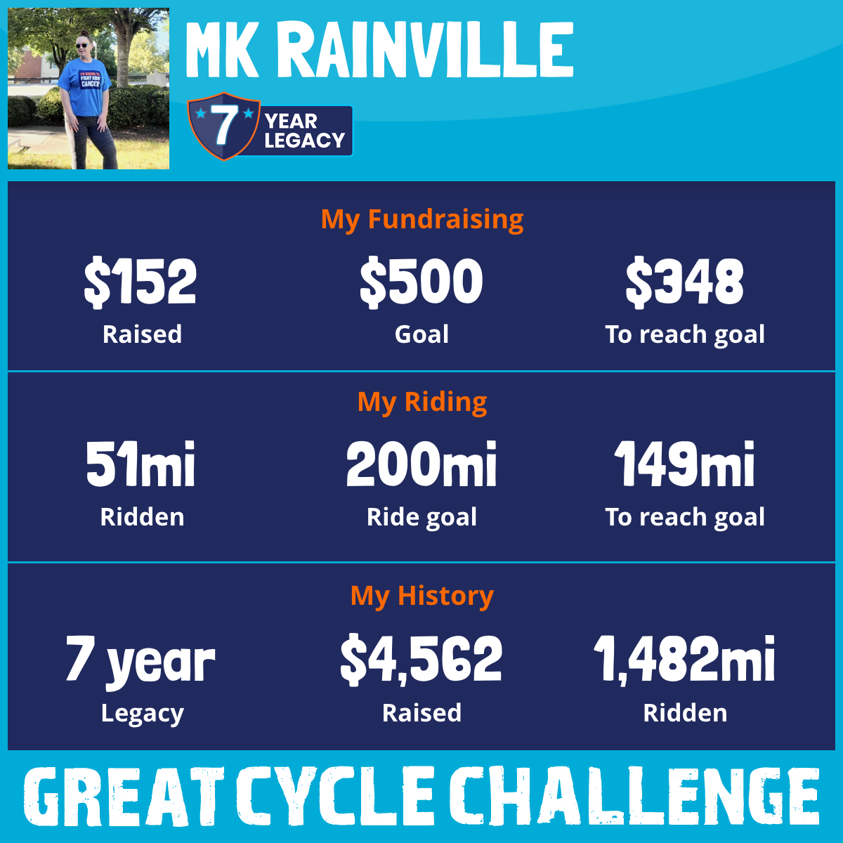 I am riding 300 mi to fight kids' cancer and save little lives. Please sponsor me to support my challenge!