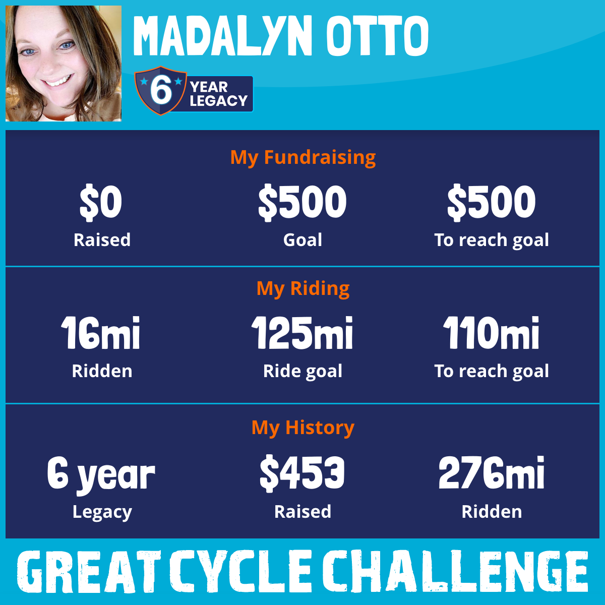 I am riding 125 mi in memory of Grandma Millie, Deb Butler, Grandpa Walter. Please sponsor me and support my challenge to fight kids' cancer and save little lives.