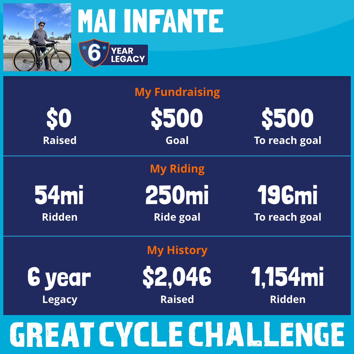 296 mi Ridden$1,001 Raised2023
