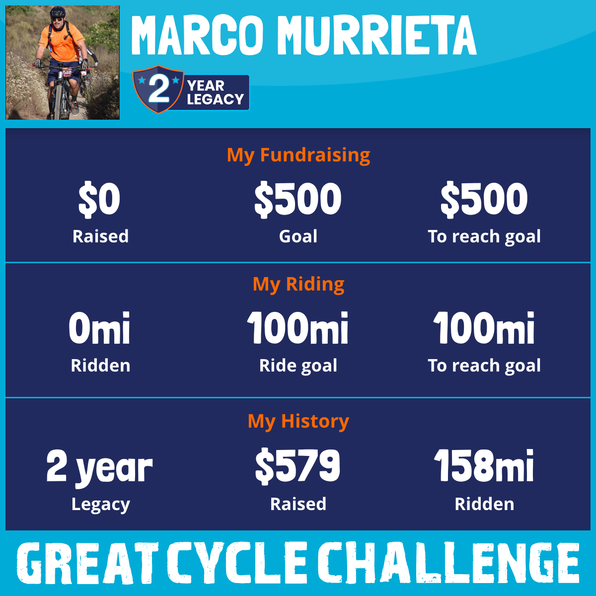 I am riding 100 mi in memory of Marco Antonio Murrieta. Please sponsor me and support my challenge to fight kids' cancer and save little lives.