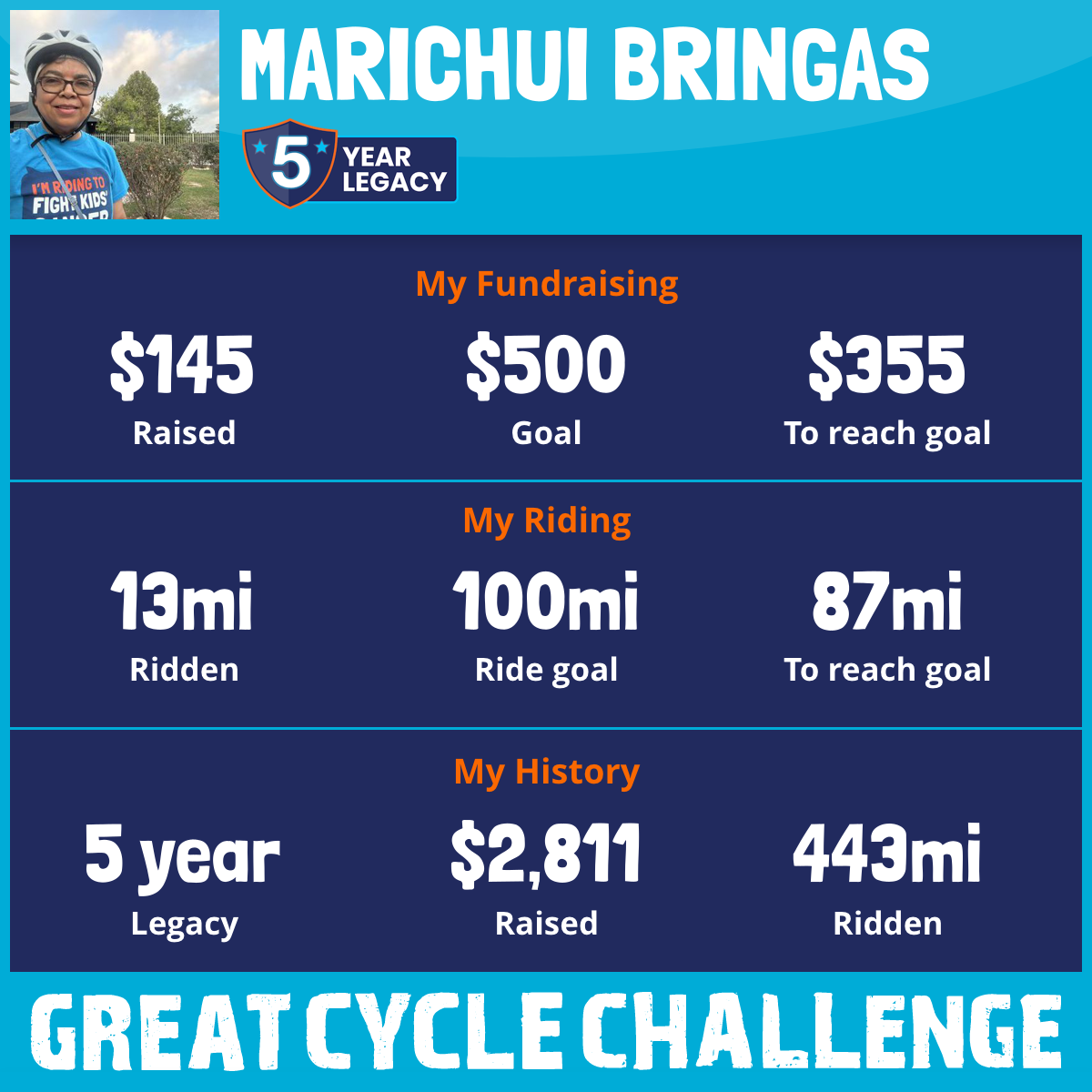 So I am raising funds through my challenge to help these kids and support Children's Cancer Research Fund to allow them to continue their work to develop lifesaving treatments and find a cure for childhood cancer.