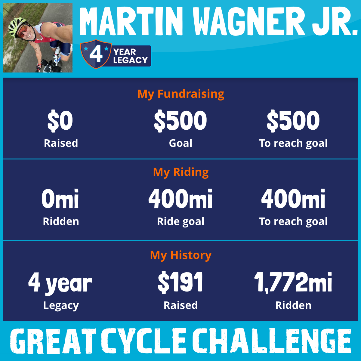 I am riding 400 mi for Lorraine Wagner. Please sponsor me and support my challenge to fight kids' cancer and save little lives.