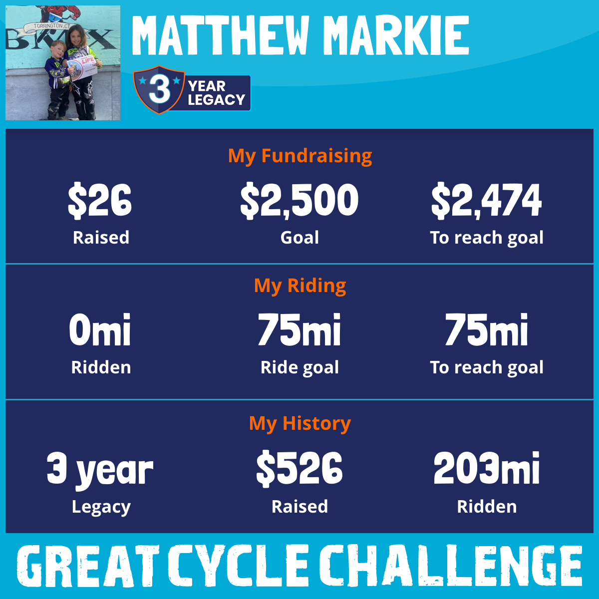 So I am raising funds through my challenge to help these kids and support Children's Cancer Research Fund to allow them to continue their work to develop lifesaving treatments and find a cure for childhood cancer.