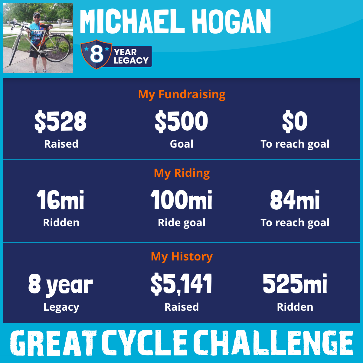 This September, I am taking part in the Great Cycle Challenge to fight kids' cancer! This is my sixth year. Unfortunately, this year I will be doing my low mileage riding on an exercise bike due to recent hip replacement surgery.