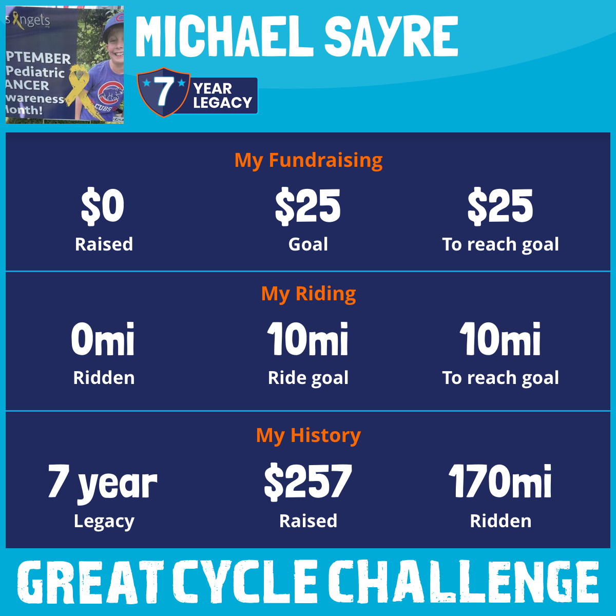 I am riding 10 mi for Will Yudys. Please sponsor me and support my challenge to fight kids' cancer and save little lives.