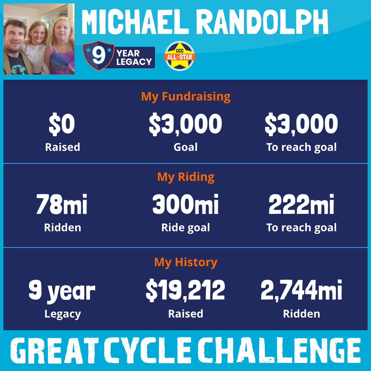 This September, I am taking part in the Great Cycle Challenge to fight kids' cancer! I have ridden the past 7 years and loved it. This year I'm riding for my kids... grateful for their health... and for parent's facing a challenge I can't even imagine. Kudos to the parents who are a rock for their kids facing impossible odds. I can't even fathom your strength... fight on sweet familes, fight on.