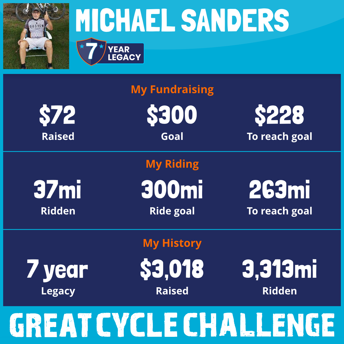 I am riding 300 mi in memory of Sue Sanders. Please sponsor me and support my challenge to fight kids' cancer and save little lives.