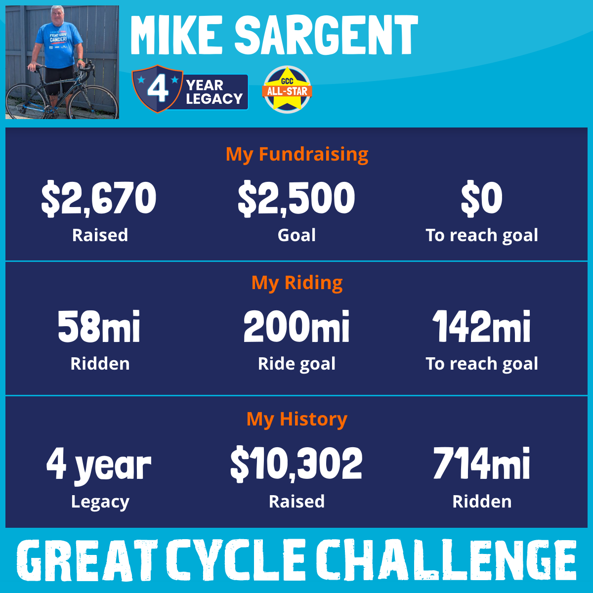 28 Aug 2025I'm only $145 from my goal of raising $2500 for the 3rd year in a row. Riding starts Monday and I can't wait! If you can, please donate whatever you can put me over the top!