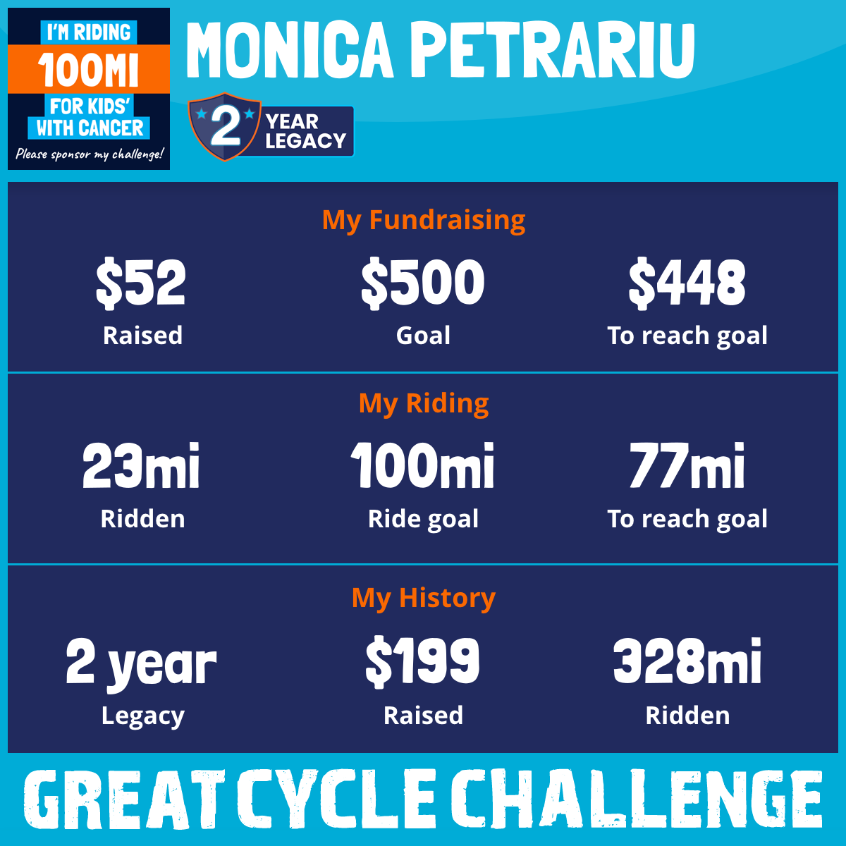 I am riding 100 mi to fight kids' cancer and save little lives. Please sponsor me to support my challenge!