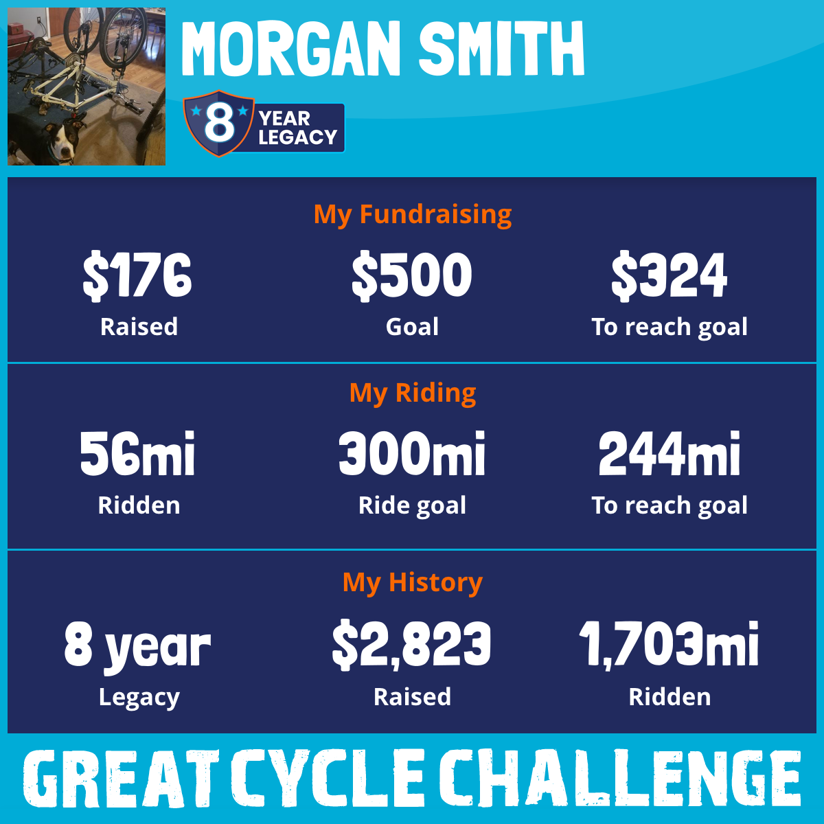 Year 8! It's been an amazing experience to use my favorite pass time to raise money for kids that can't get out there and ride themselves, thank you to anyone taking the time to check out my page, and I highly encourage everyone to get out and ride, if they can, it really is one of the best things ever.