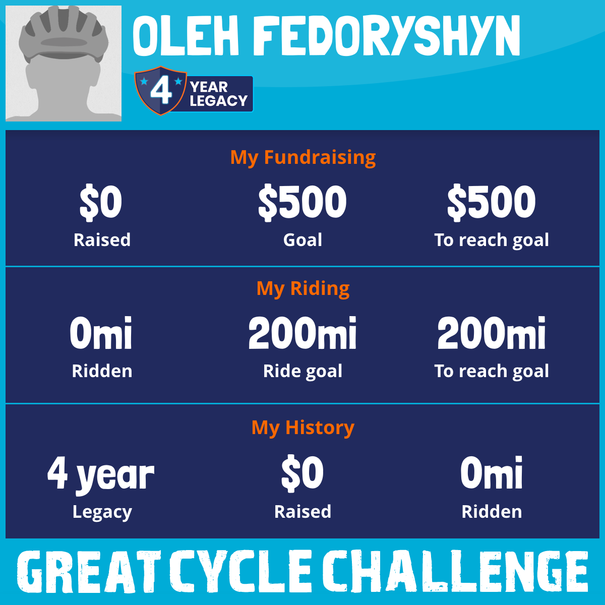 I am riding 200 mi for my wife, Zoryana. Please sponsor me and support my challenge to fight kids' cancer and save little lives.