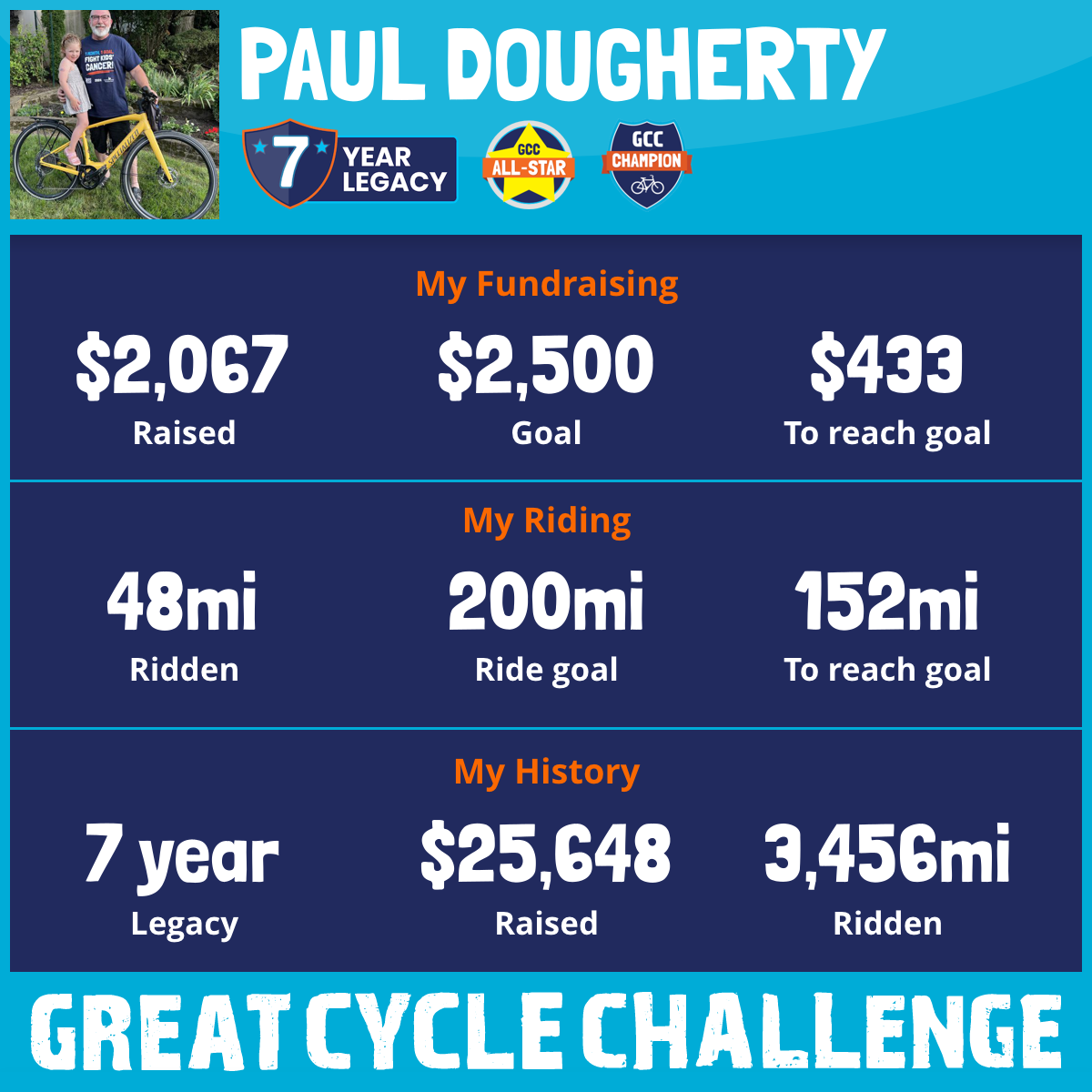 I will be riding in The Great Cycle Challenge in honor of 6 year old Stella Waltemire. Stella was diagnosed with standard risk B cell ALL (acute lymphocytic leukemia) on 3/1/2021! Doctors thought that she had beat cancer but it returned in December of 2023, just a few days before Christmas. Stella had a bone marrow transplant from her 6 year old brother last April. I am happy to report that even though it was touch and go for a while last year - Stella is thriving now! We have a lot more work to do! I am asking if anyone out there can help by donating to the Childhood Cancer Research Fund! Thanks to all that have helped me the past 6 years! God Bless! Your donations fund cancer research and helps develop new childhood cancer treatments with less toxic drugs to fight this rotten disease! We will do anything in our power to help bring that change to fruition. I am here to do my part to raise money for childhood cancer research and I hope my friends and family will do their part by donating to this cause! My dream is that we can find a cure for Stella's cancer and all the other children fighting cancer! Thank You!