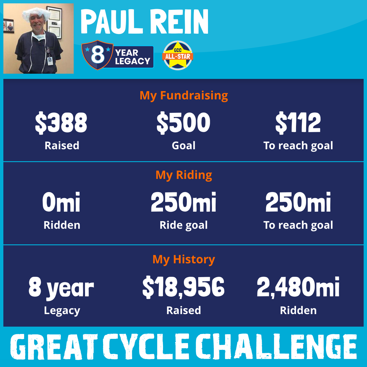 This September, I am taking part in the Great Cycle Challenge to fight kids' cancer! Unfortunately 10 days ago I was doing a training ride for this great event to raise money to help defeat childhood cancer. Suddenly, BOOM I hit a hole in the road and go down. Fortunately a nice out of town couple stopped to help me, called 911 and I was taken to RRMC and have care from a Level 2 trauma center. I had, a broken clavicle requiring surgery. Additionally I had 9 broken ribs all on the right side. Add on multiple contusions and skin injuries requiring a skin vac, and probably surgery on right lower leg for a skin graft. HOWEVER I AM STILL ASKING FOR A DONATION HELP IN THIS FIGHT. SO IF YOU FEEL LIKE YOU CAN A DONATION WOULD BE HIGHLY APPRECIATED.