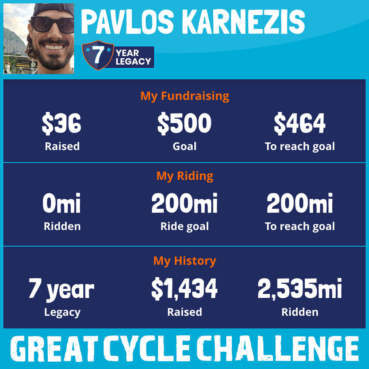 I am riding 200 mi in memory of Kosmas Garderis. Please sponsor me and support my challenge to fight kids' cancer and save little lives.