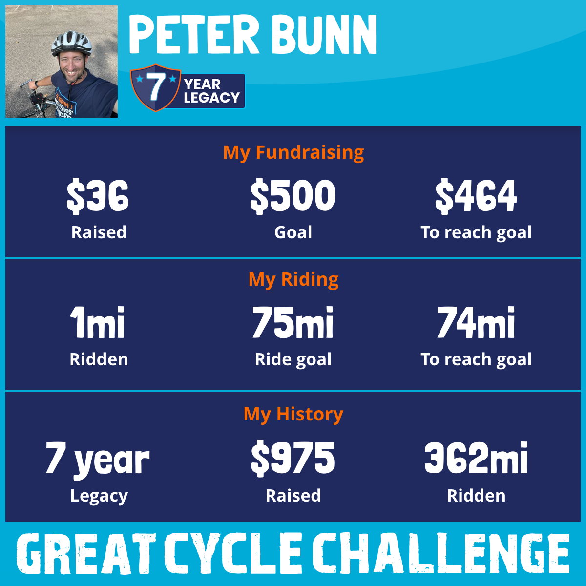 I am riding 75 mi for Daniel Bunn. Please sponsor me and support my challenge to fight kids' cancer and save little lives.