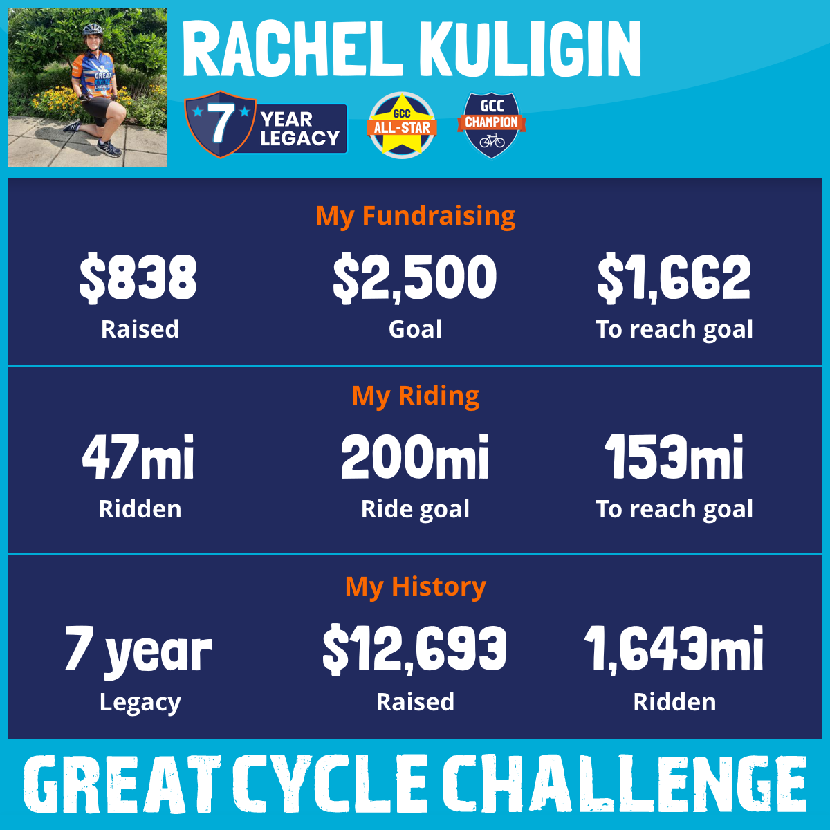 22 Sep 2025Thank you everyone for your prayers and financial support! I have completed my 200 mile commitment and YOU have reached my fundraising goals! I am so appreciative of all the support and interest this year. I hope to return again next year and ride for Children's Cancer Research Fund. May you all be blessed!