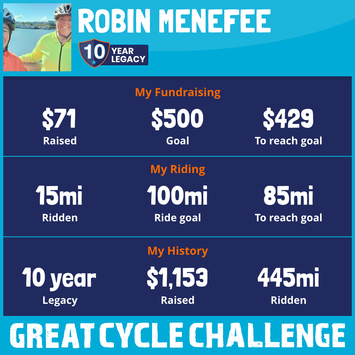 I have participated in the Great Cycle Challenge for 9 years because it supports a cause that is near and dear to my heart.