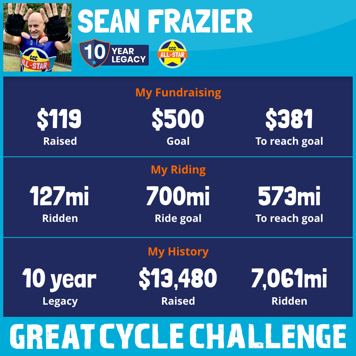 Penultimate day of GCCUSA to raise money for The Children’s Cancer Research Fund!! Please donate at the link in my bio or at https://greatcyclechallenge.com/Riders/SeanFrazier