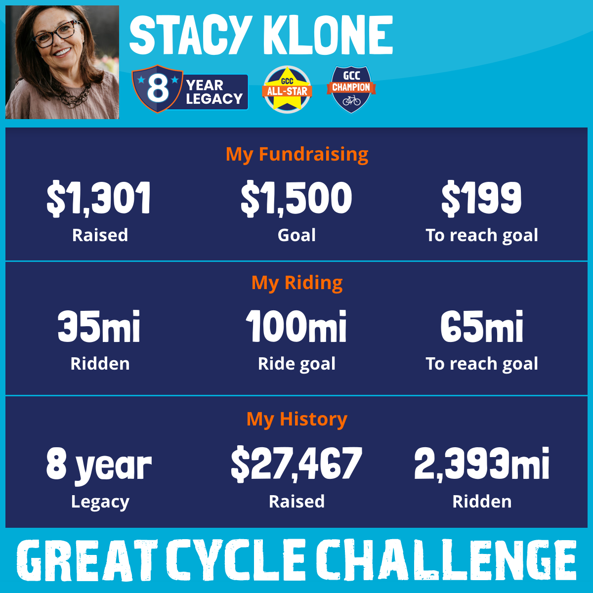 I am participating in the Great Cycle Challenge (GCC) for the 7th year to fight cancer for kids of all ages. I'm riding for someone's child, sister, brother, grandkid, cousin, or dear friend battling cancer right now!