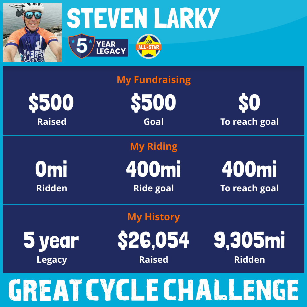 This is my fifth year biking in the Great Cycle Challenge to support research to end childhood cancer.