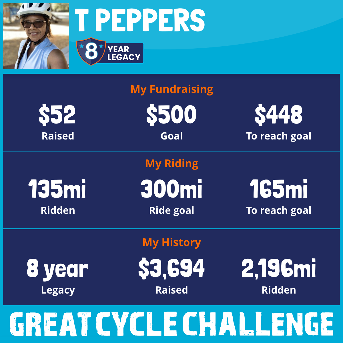 I am riding 300 mi for Pep. Please sponsor me and support my challenge to fight kids' cancer and save little lives.