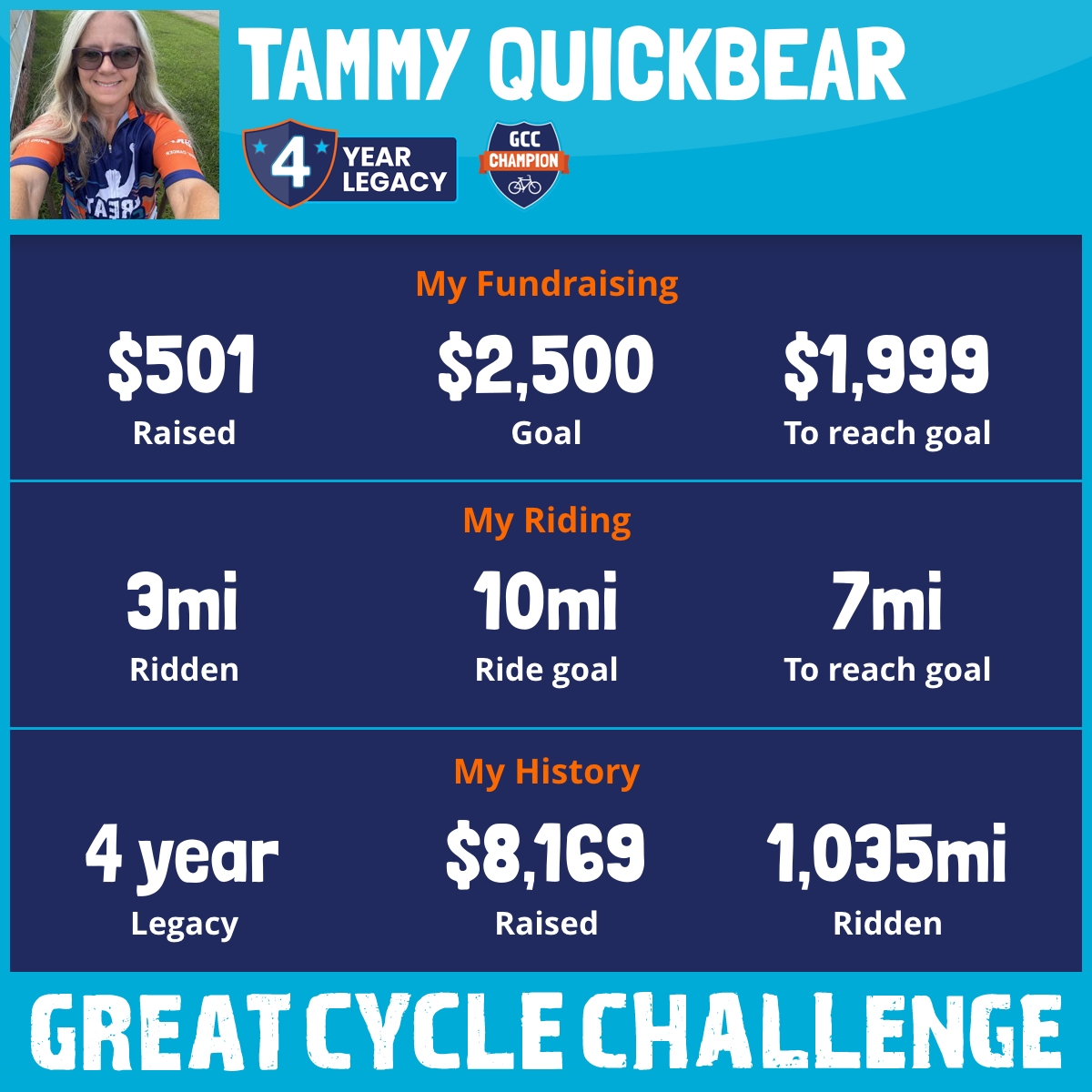 This September, I am taking part in the Great Cycle Challenge to fight kids' cancer! Due to medical reasons I am unable to ride unfortunately. I am still participating in other ways . I am walking and logging the miles I get in that way. I am under drs orders to not be to active. I might need a hysterectomy in the near future unless we figure something else out. I hope you can find it in your heart’s to donate.