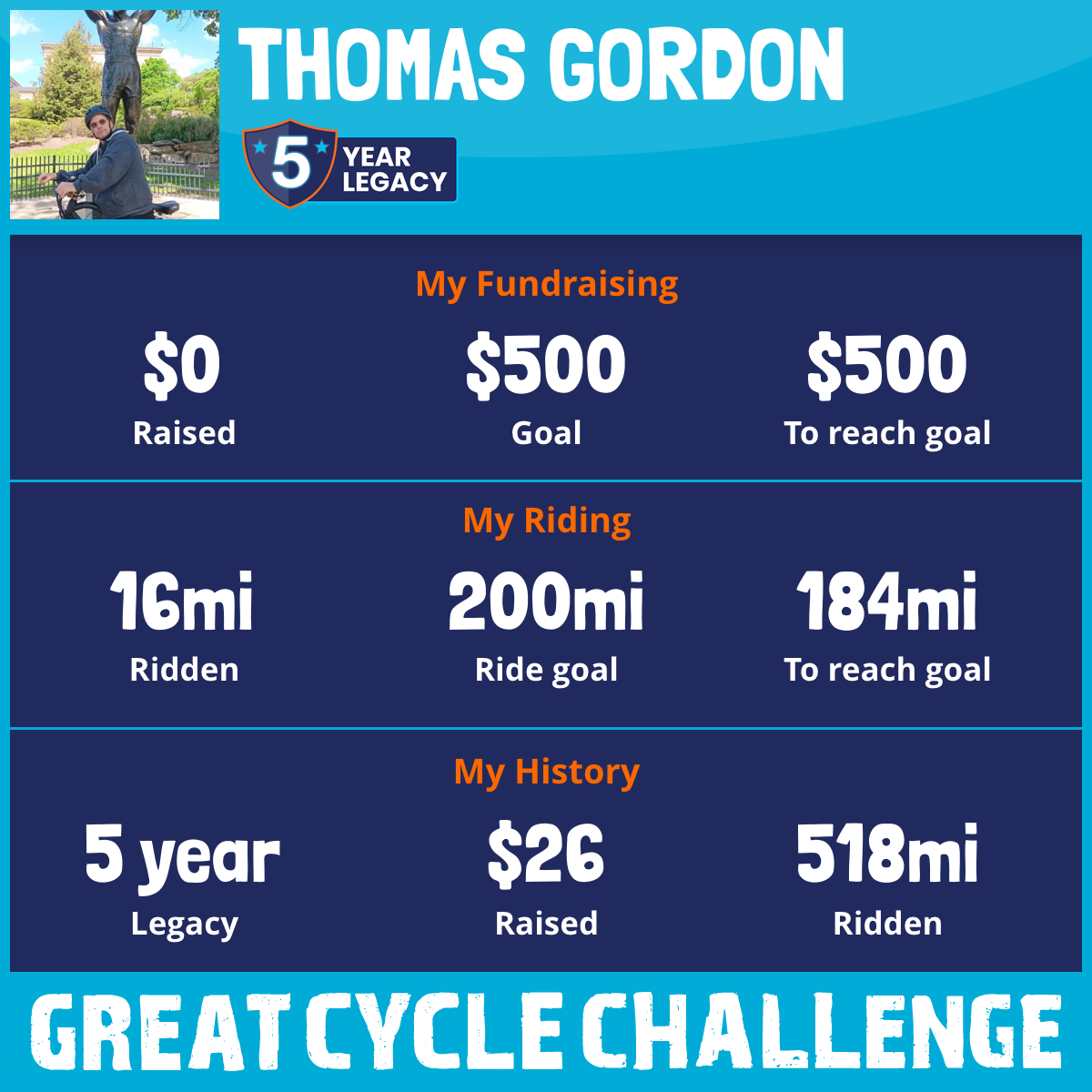 I am riding 200 mi in memory of my dad, Thomas. Please sponsor me and support my challenge to fight kids' cancer and save little lives.