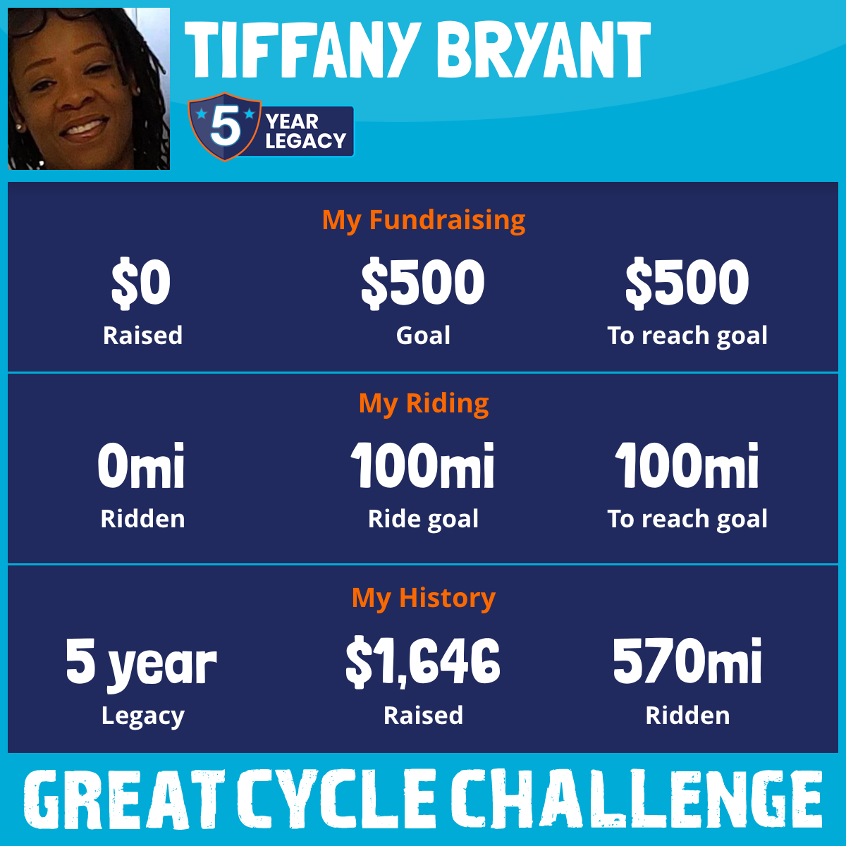 I am riding 100 mi in memory of Maurice Wayne Bryant & Tawanna Jackson. Please sponsor me and support my challenge to fight kids' cancer and save little lives.