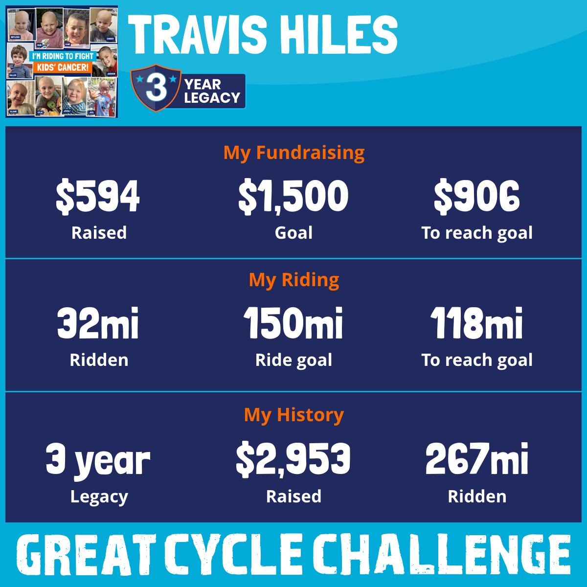 So I am raising funds through my challenge to help these kids and support Children's Cancer Research Fund to allow them to continue their work to develop lifesaving treatments and find a cure for childhood cancer.