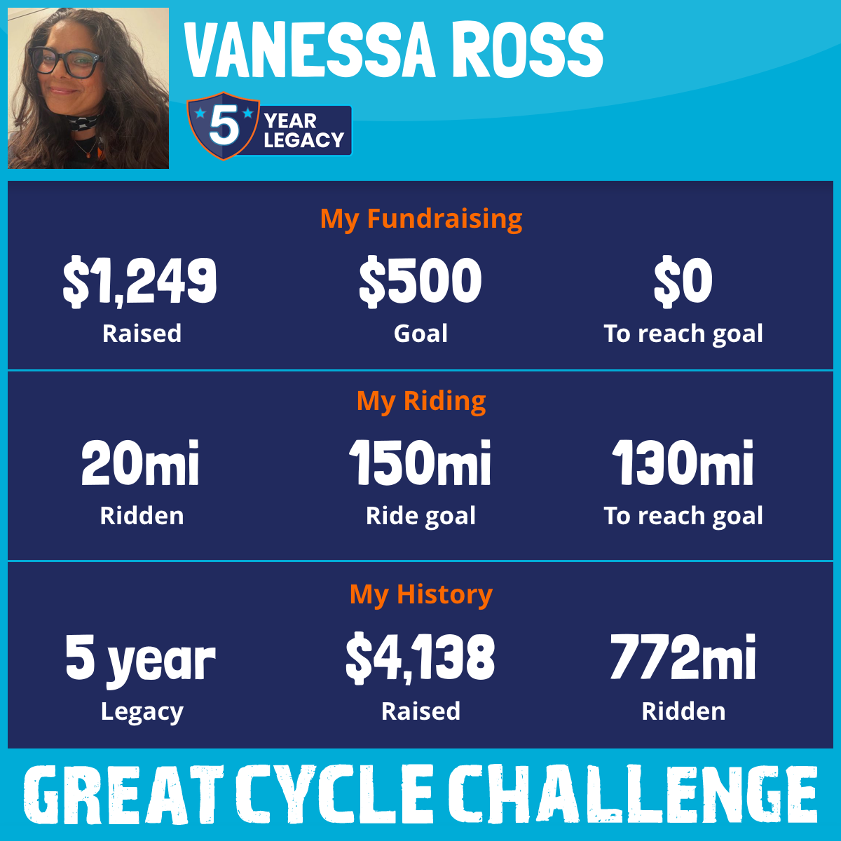 This month I set out to ride 150 miles through the Great Cycle Challenge to support kids fighting cancer. Not only did I hit my goa, I went beyond it. I rode 161 miles, and thanks to incredible support, I raised $1,655 — over three times my $500 goal.
