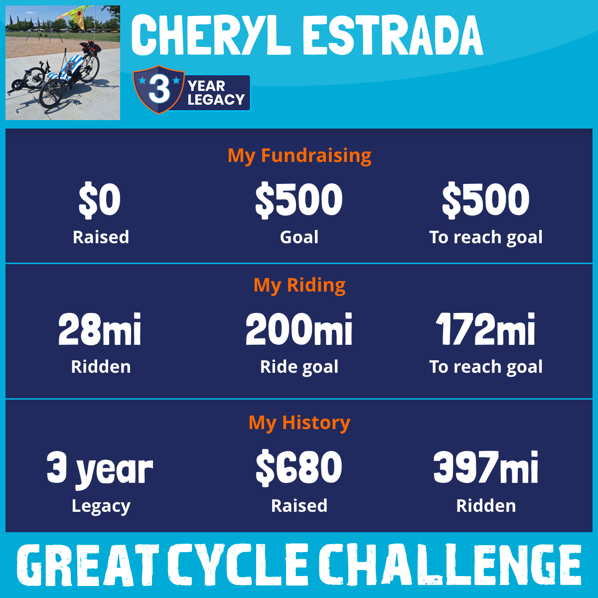 You funny thing about this ride is that I'm a trike rider it is Maverick G.T. 18 and most if not all trike ride we love riding them just wait to saddle up set back and take off for a few mile to 20, 20 or even 40 miles. Most if not all trike riders are retired so we have the time and the desire to saddle up. I'm retired Military and former OTR Caring for my spouse recovering fro a stroke so my time is dealt out to me by the hours so if I could get six hour to ride I'm going to make the best of it. So is I could help other (Kids with Cancer) and do something I love do I will. I've promised Great Cycle Challenge first 100 miles then 150 which I made 165miles with a $500. donation well I fail short on the donation can you help me help the kids thank you again.