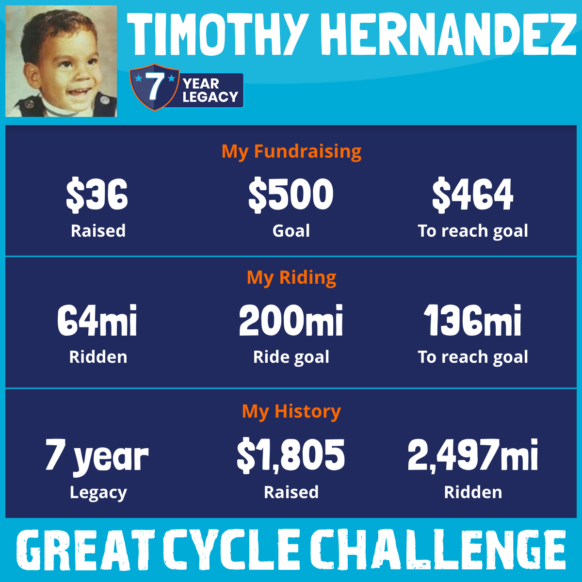 In June 2019, I completed the Great Cycle Challenge to fight kids' cancer. I've done the same every year since then. I've pledged to ride 200 miles in 30 days in memory of my cousin, Michelle Sullivan, who survived childhood leukemia but endured many other health challenges throughout her short life.